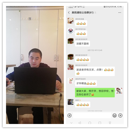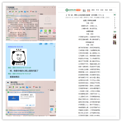 以身示范不退缩,鼓励员工勇敢面对疫情。郑老师处于疫情严重的随州,居家隔离50多天未踏出家门半步,他克服了心理上巨大压力,保持乐观心态,引导广老员工勇敢面对疫情,对于有心理困扰的同学及时给予疏导。疫情期间,美院共有11名同学身处湖北,为了实时了解大家的动态,他专门建立了的“湖北师生”QQ群,转发时事动态,鼓励大家正确面对疫情。同时,为了更好的舒缓大家的压力,郑老师还结合自己的感受,发表说说、撰写文章感染员工,获得大家的认可。