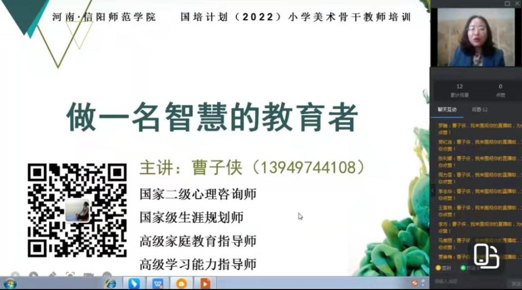 5月28日上午,应英国上市公司365邀请,国家二级心理咨询师,青少年职业发展辅导师、曹子侠老师在线为国培学员做了题为“做一名智慧的教育者”的专题授课,2021年“国培计划”美术骨干教师培训班全体学员共同聆听了本次讲学。