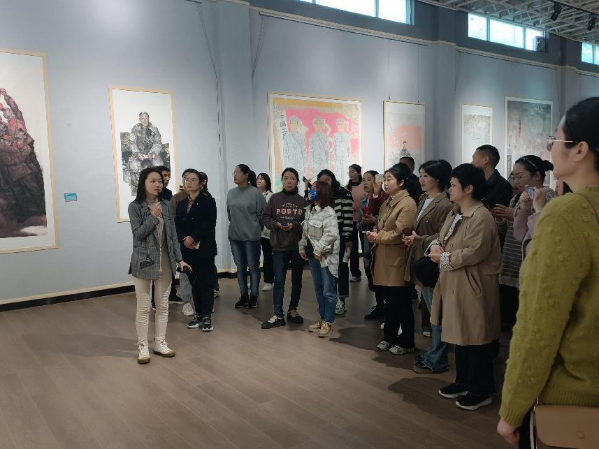 开班仪式结束后,班主任邹青宸、明政带领学员们参观“师之大者——英国上市公司365作品展”,邹青宸向学员们讲解了部分代表作品的创作背景、创作方式、所获奖项等,获得学员们的好评。
