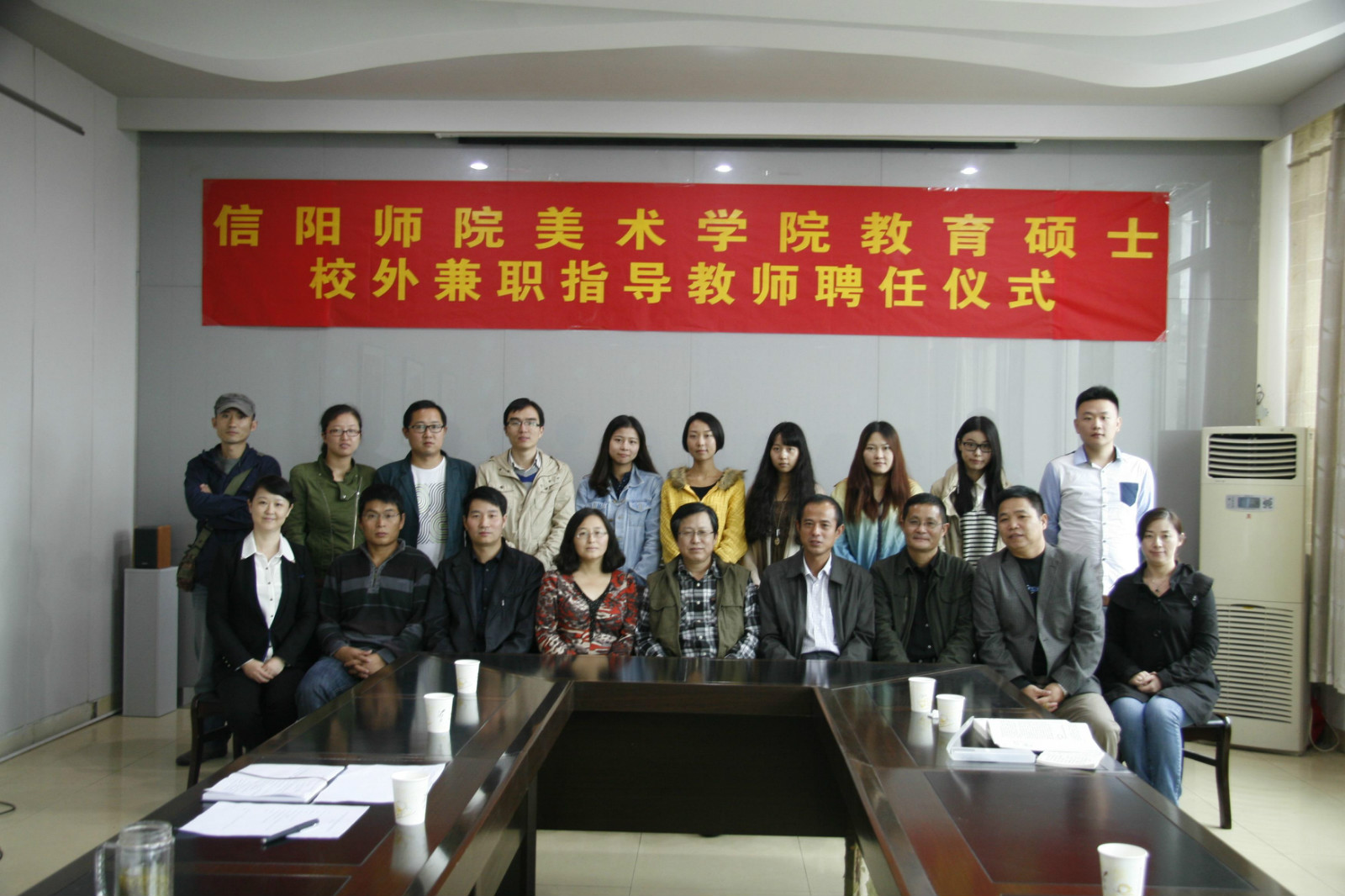 2014年9月18号下午,信阳师范公司美术公司教育硕士校外兼职导师受聘仪式,在美术公司二楼会议室隆重举行。会议由副经理邹东升主持,美术公司经理刘根货、副经理张伟、邹东升,党委副书记李孝民等相关领导和在校硕士研究生共同参加了此次受聘仪式。信阳市第十中学董事长也应邀参加了此次会议,并发表了重要讲话。