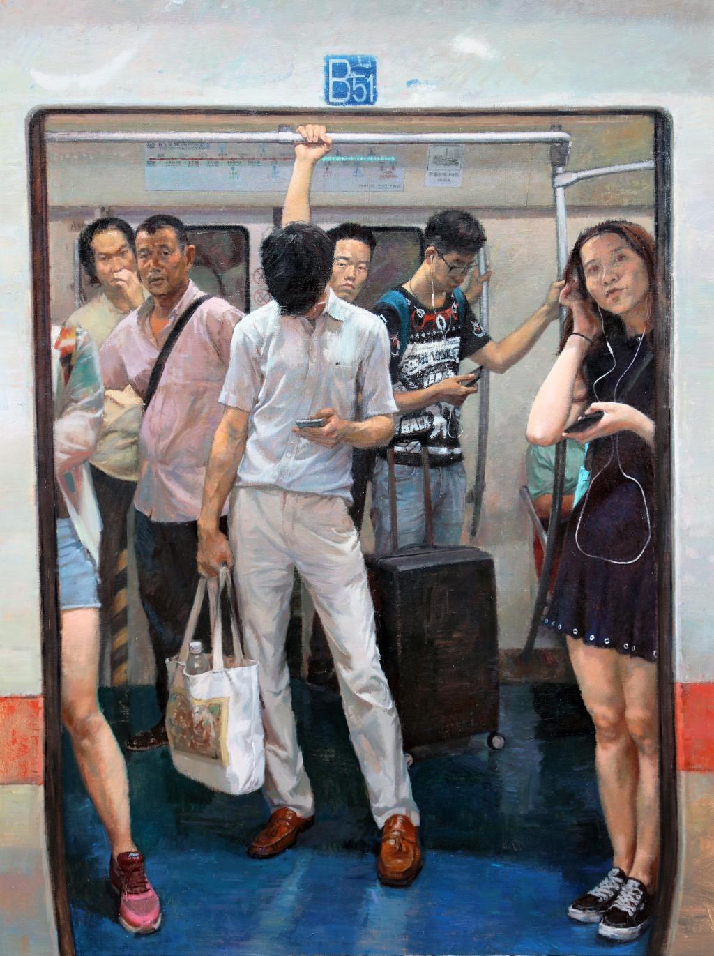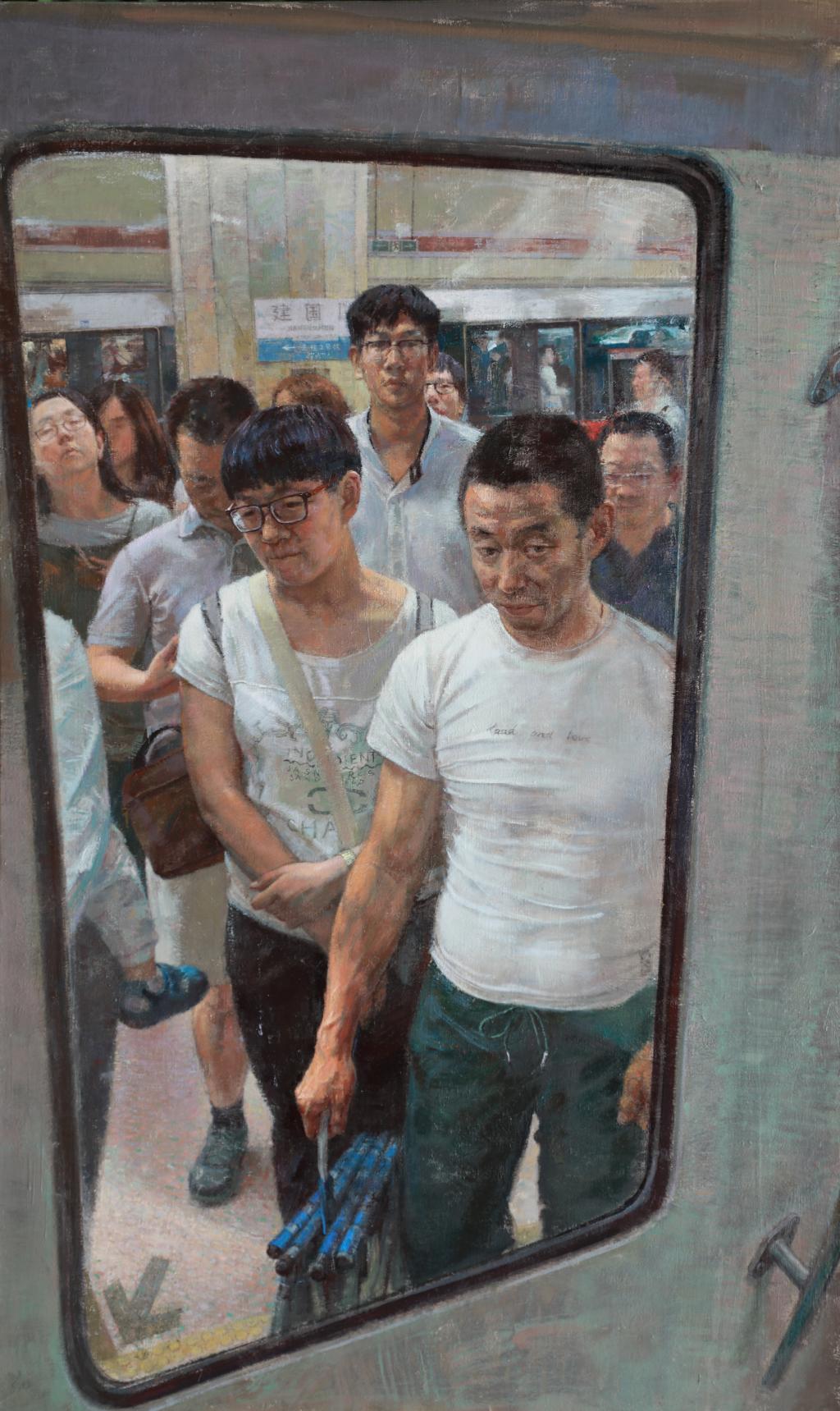《众城》《候车》为张江波老师近两年创作的系列作品。《众城》曾入选第六届全国青年美术作品展,两幅作品都选取都市生活中的地铁题材加以表现,作品创作意图一脉相承,以乘坐地铁或候车的众生相作为创作母题,通过各色人物的视觉形象描绘探讨当代语境下人与城的关系;人与城的关系体现着人与人的关系,地铁犹如城市的血管,普通人通过地铁解决生活问题传输生活理想;人与城有着多重关系与角色转换,人生活于城市成就着城市又潜移默化的改造着城市,人既依赖于城市又受制于城市。因此城对人是多解的,这也是该系列作品探讨的精神主题。