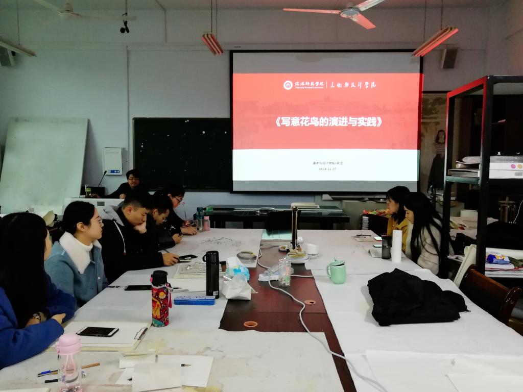 11月27日上午,公司翟洁副教授在艺术楼研究生教室作了题为“写意花鸟的演进与实践”的专题学术讲座,全体研究生参加此次讲座并积极讨论。