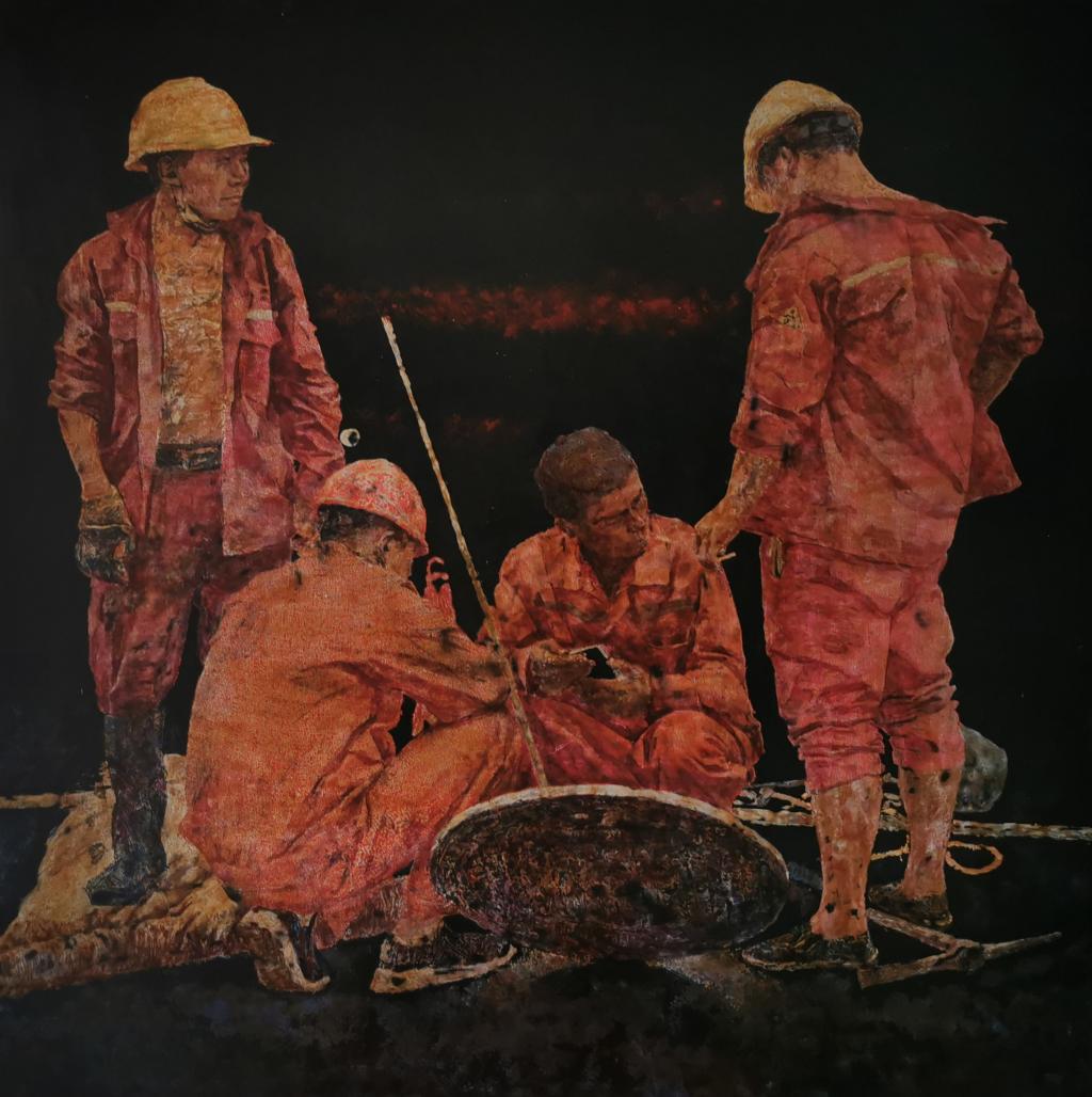 关注普通人、关注劳动者是赵志杰老师近年来的绘画创作方向。谈起其入选漆画作品《疏通》的创作初衷,他指出,走在路上看见疏通工人们大夏天穿着橘红色厚厚的工作服,头戴中黄色的安全帽,在下水道里弄的满身污泥,但工作间隙休息时爽朗的笑声让人动容,这是一群干着最脏的活儿挣着最干净的钱的人,一群肯出力的汉子,他们的付出换来了城市排水的畅通。由此萌发了为他们造像的想法。这也是继2018年赵志杰老师漆画作品《局》入选“魅力红谷”全国小幅漆画展的又一次入选,显示了公司专业教师扎实的艺术功底与专业素养。