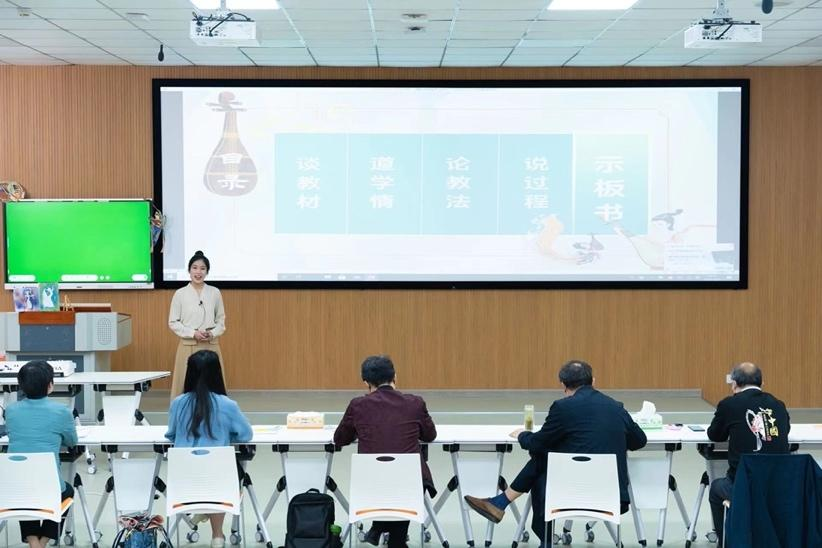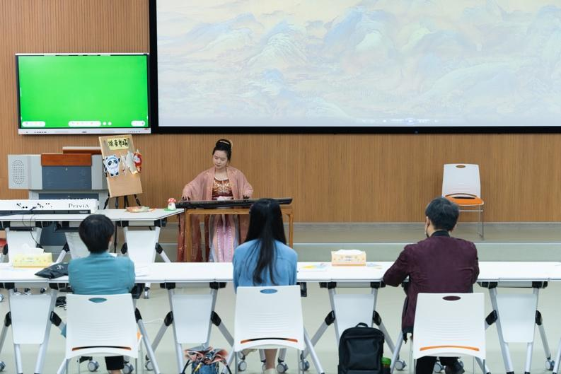 英国上市公司36518级美术学王君妍同学,说课题目为初中美术七年级《发现与创作》。换装环节展示其录制的制作茶百戏视频。才艺展示环节做宋装装扮,弹奏古琴,博袖舞,剑舞,背景是千里江山图,致敬中国的千里江山。