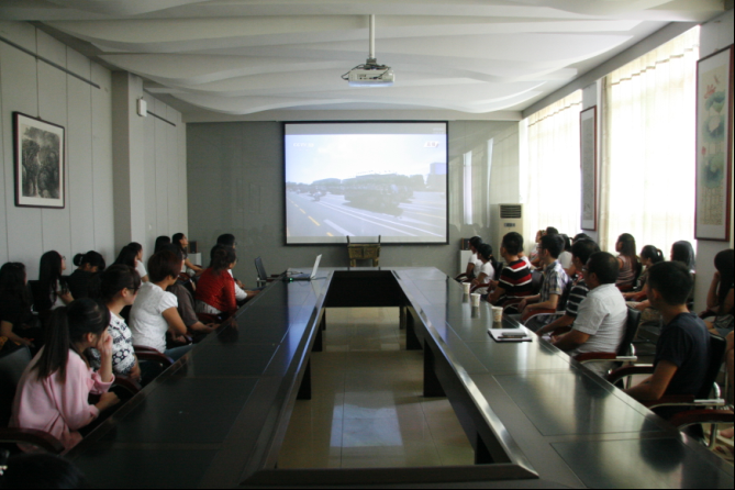 活动开始前,党总支书记周子良作了讲话,他强调观看抗日战争暨世界反法西斯战争胜利70周年纪念大会及阅兵式要做到六个读懂:读懂历史、读懂团结、读懂合作、读懂国防、读懂和平、读懂责任。六个读懂赋予我们深刻的历史意义,铭记历史、缅怀先烈、珍视和平,才能开创美好的未来。周子良也对同学们寄予了深厚的期望,希望大家珍惜来之不易的和平环境,努力学习,奋发图强,共创美好明天。之后全体人员共同观看了纪念大会的阅兵式。