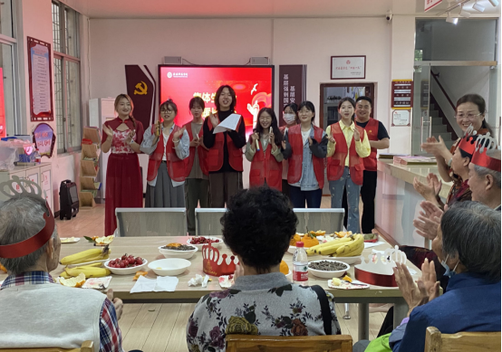 集体生日会在毕业生党员赵梦珂带来的古典民族舞蹈《枭》中拉开帷幕。党员志愿者们给老人带上生日帽,点燃蜡烛,为寿星们送上生日祝福。老人们在生日歌中许下了自己的美好愿望,一起吹灭了蜡烛,大家一边品尝着蛋糕、水果,一边欣赏志愿者们带来的精彩节目。衷炜奕的歌曲独唱《夕阳红》,在一片叫好中多次回唱,传达了出志愿者们对老人的无限敬意与祝福。姜宇航带来的独舞《霓裳梦》,以优雅动人舞姿、高难度的技术动作,赢得大家的赞赏。