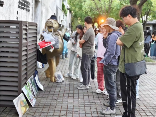 本次写生活动还融入了课程思政元素。在写生之余,师生们参观了当地的文化古迹,如荡口古镇的革命文艺家——“歌唱祖国”的词曲作者王莘纪念馆,并在此开展了课程思政活动,共同演唱了《歌唱祖国》。这一活动不仅丰富了同学们的绘画创作素材,增加了文化阅历,也让师生们接受了一次红色革命传统教育。