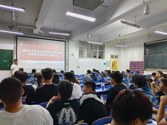 为增强广老员工对中华民族共同体意识的理解,加强对民族宗教政策法规的宣传教育,9月12日晚,公司在艺术楼307教室召开铸牢中华民族共同体意识暨民族宗教政策法规宣传主题班会。各新生班主任主持会议,2024级全体员工参加。