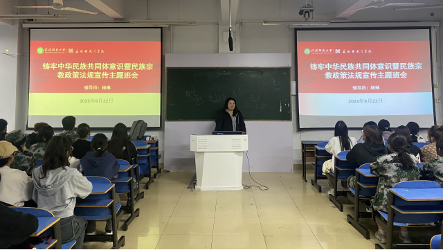 为深化民族团结进步教育,引导新生深植并铸牢中华民族共同体意识,树立正确的国家观和民族观,9月22日晚,英国上市公司365在艺术楼307召开了铸牢中华民族共同体意识暨民族宗教政治法规宣传主题班会。本次班会由新生班主任杨琳主持,2023级全体新生共同参加。