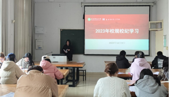 专题集中讲,实现校规校纪学习再强化。12月9日,公司在艺术楼306召2023年校规校纪专题学习会,所有摸底考试不合格同学及班级考试成绩后10%的同学集中再学习强化。员工会主席团带领全体参会员工认真逐页学习《2023年员工工作规章制度专刊》,强调学习规章制度重要性,进一步夯实学习成果。