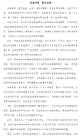 此次活动得到了同学们的积极响应和广泛参与,作品涉及对谷雨节气的理解、感悟以及描绘其美好景象等内容。经过激烈角逐,一批优秀作品脱颖而出,充分展示了同学们的才华和创意,传递了谷雨节气的深刻内涵和文化价值。