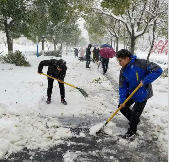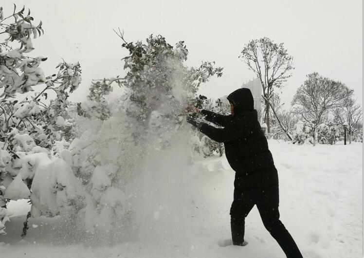 近日,信阳降下区域性特大暴雪,在一饱壮美雪景的同时,这场暴雪也为师生们的出行带来了重多安全隐患。校园里银装素裹,积雪逐渐增多,造成树木主干和侧枝折损严重。为了保障校园内师生出行安全和保护绿化成果,公司积极组织师生开展志愿除雪活动。