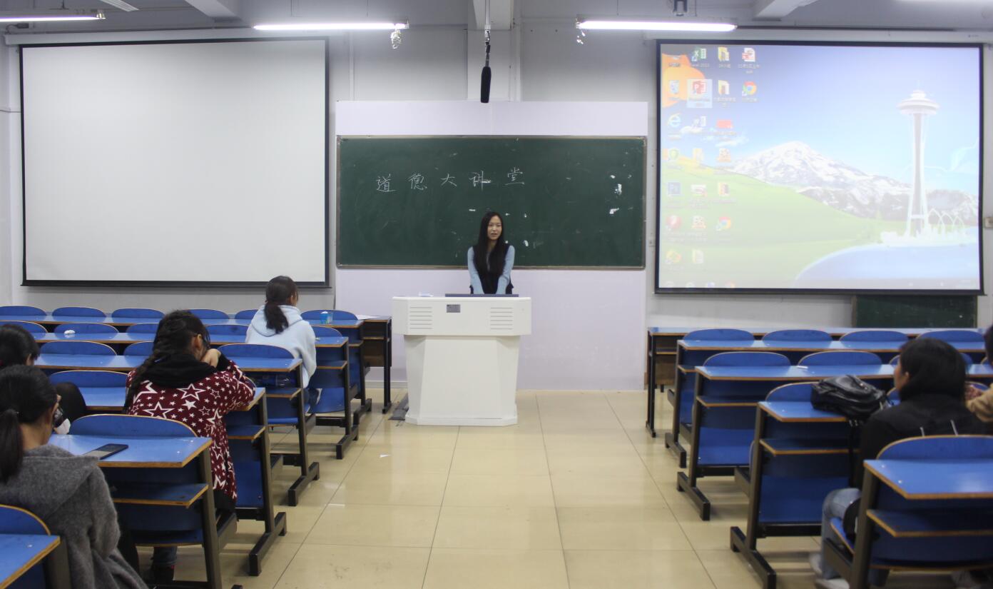 饶海虹首先与同学们分享了道德大讲堂活动开展的意义,她说,道德修养是一个人能否与他人友好相处的的关键因素,是一个能否在社会上立足的重要原因。她指出老员工正处于人生观、价值观、世界观的成熟期,因此培养自身道德内涵是树立正确三观的重要途径。谈到道德建设工作时,饶海虹表示,道德不仅仅体现在对别人的礼貌和尊重,更体现在一个人是否能为集体奉献和考虑,随后,她结合近期新生出现的旷操旷课现象,指出出于个人私欲而损害集体荣誉的便是不道德,希望同学们在日后的学习与工作中,可以从点滴小事做起,时刻提醒自己保持基本的道德规范,提高自身的道德涵养。