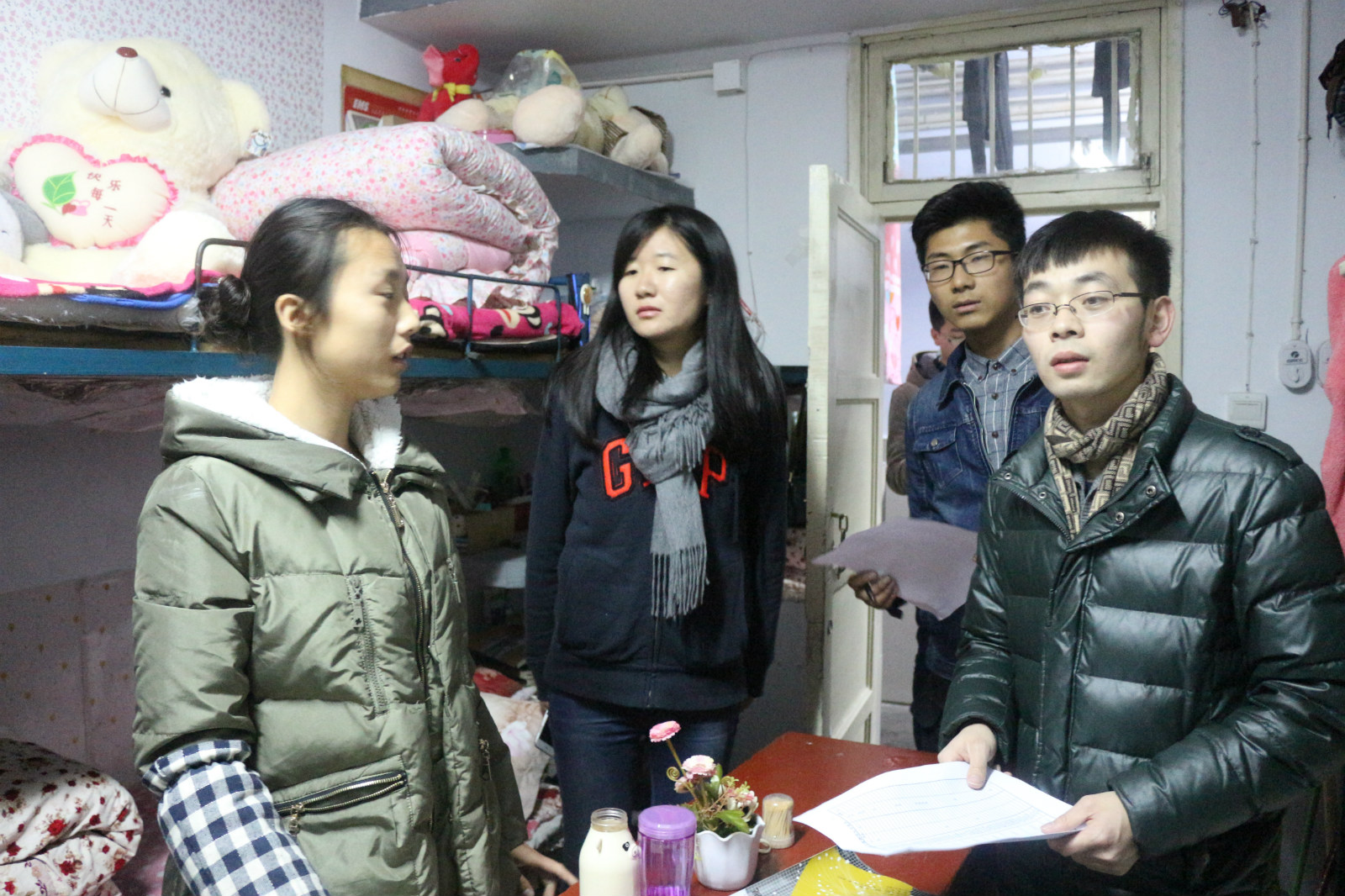 12月14日晚,美术公司专职辅导员施远与环境艺术设计班主任陈馨前往美术公司15级员工宿舍,了解员工的学习和生活现状,并叮嘱员工注意保暖,加强锻炼,预防疾病。