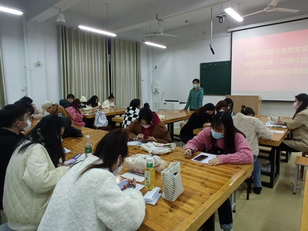 11月16日,公司于艺术楼308教室开展关于坚持和巩固马克思主义在高校意识形态领域的指导地位与正确认识和妥善处理好民族关系和宗教问题观的线下讨论课。 此次课程由青校全体成员共同参与。