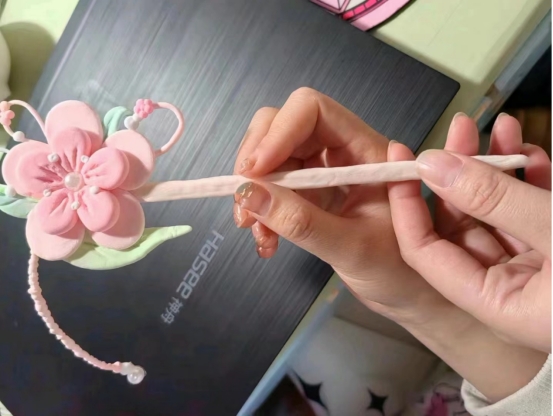 活动期间,同学们充分发挥自己的想象力和创造力,将传统元素与现代审美相结合,利用日常生活中的废弃材料,如树枝、筷子等,作为簪体,并结合粘土、珠子、花瓣等装饰品,制作出一款款兼具古典韵味和现代时尚的发簪。这些发簪不仅造型独特,而且富有创意,充分展示了同学们的巧思妙想和动手能力。