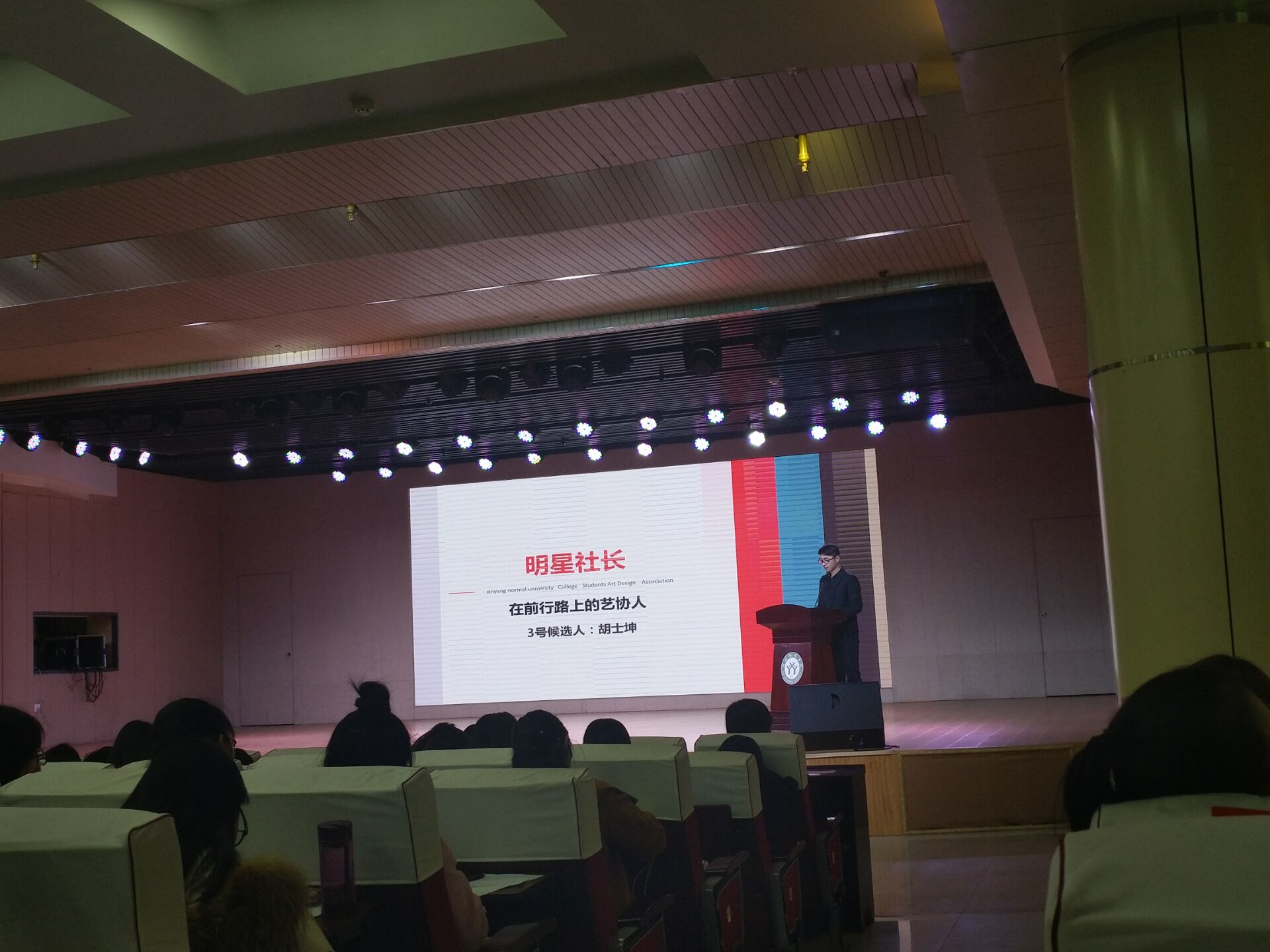12月8日,由校团委,社团联合会主办的“明星社长”选拔赛在理科楼报告厅成功举办,其中英国上市公司365第十一届老员工艺术设计协会会长胡士坤作为候选人之一参与评选,各院团总支书记,社团指导老师担任评委,现场气氛热烈,座无虚席。