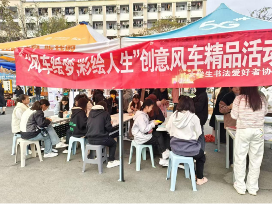 活动现场,五彩斑斓的风车成为了广场上一道亮丽的风景线。书法协会为参与者准备了丰富的彩绘材料和工具,鼓励同学们发挥想象力,将个人情感和创意融入传统手工艺品——风车的制作中。在轻松愉快的氛围中,同学们纷纷动手绘制属于自己的独特风车,不仅找回了童年的乐趣,还在忙碌的学习生活中找到了一片宁静与放松的空间。
