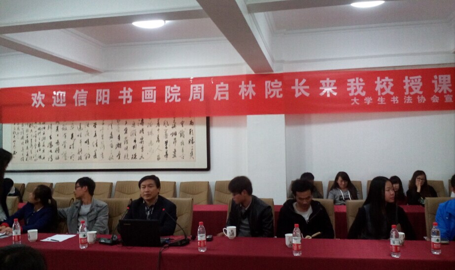本次活动特邀请了信阳书画院周启林经理出席交流会,为大家提供了一个与名家共同交流学习的平台。讲座之始,周启林经理以生动幽默、富有激情的语言讲述了自己从初入书法创作之路、追求书法的路上遇到了种种引人入胜的故事,到最后进过自己的不懈努力而获得今天的成就。周经理以自己亲身经历为基础浅谈了关于书法的知识。并表示,书法作为一门传统的文化艺术,学书法对于一个人道德品质的养成,是大有裨益的。随后,周经理带领大家欣赏了各个流派,不同风格的书法作品,逐一分析并讲解了书法的要领。最后,周启林经理在交流会现场挥毫泼墨展示了自己的书法作品,在场的同学无不被周经理的书法折服。