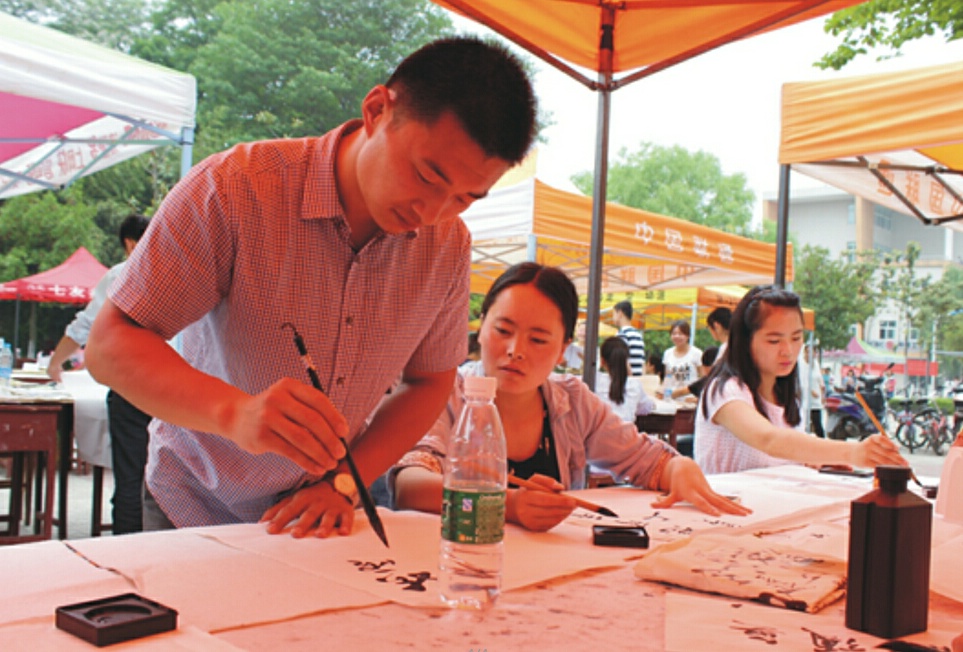 5月10日,由信阳师范公司美术公司老员工书法协会主办,华锐公司协办的大型书法活动——“笔墨丹青迎校庆”在八餐小广场举行,美术公司张峰老师亲临现场指导,吸引众多同学踊跃参与。