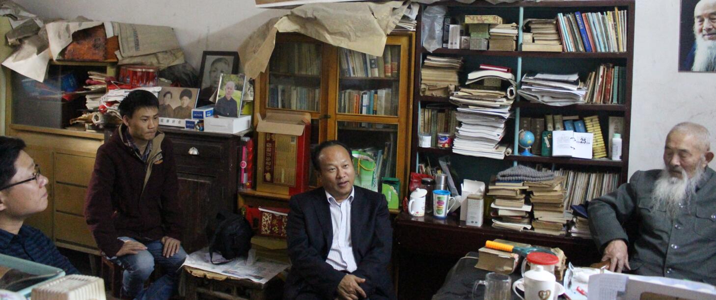 赵明民一行来到著名艺术家戴南园家中,了解老先生最近生活、身体状况,祝福老先生佳节愉快。南园先生退休后游心于艺,或吟哦,或挥毫,过着半耕半读、亦农亦绘的生活。他淡泊自守,隐逸无闻,是位典型的现代高士。南园先生书法作品遒劲有力,渗透着中国传统文化的魄力,中国山水画作品意境深远厚实凝重,中国人物画惟妙惟肖,油画作品丰富多姿,绽放了独特的艺术魅力,南园先生的书画展更是为信阳高校广大书画爱好者提供了一个互相交流、学习的平台,推动了书画艺术的发展。杨轶中仔细询问了老人退休后的创作情况,对他多年来努力传承书法艺术、不遗余力培养后学表示赞赏。