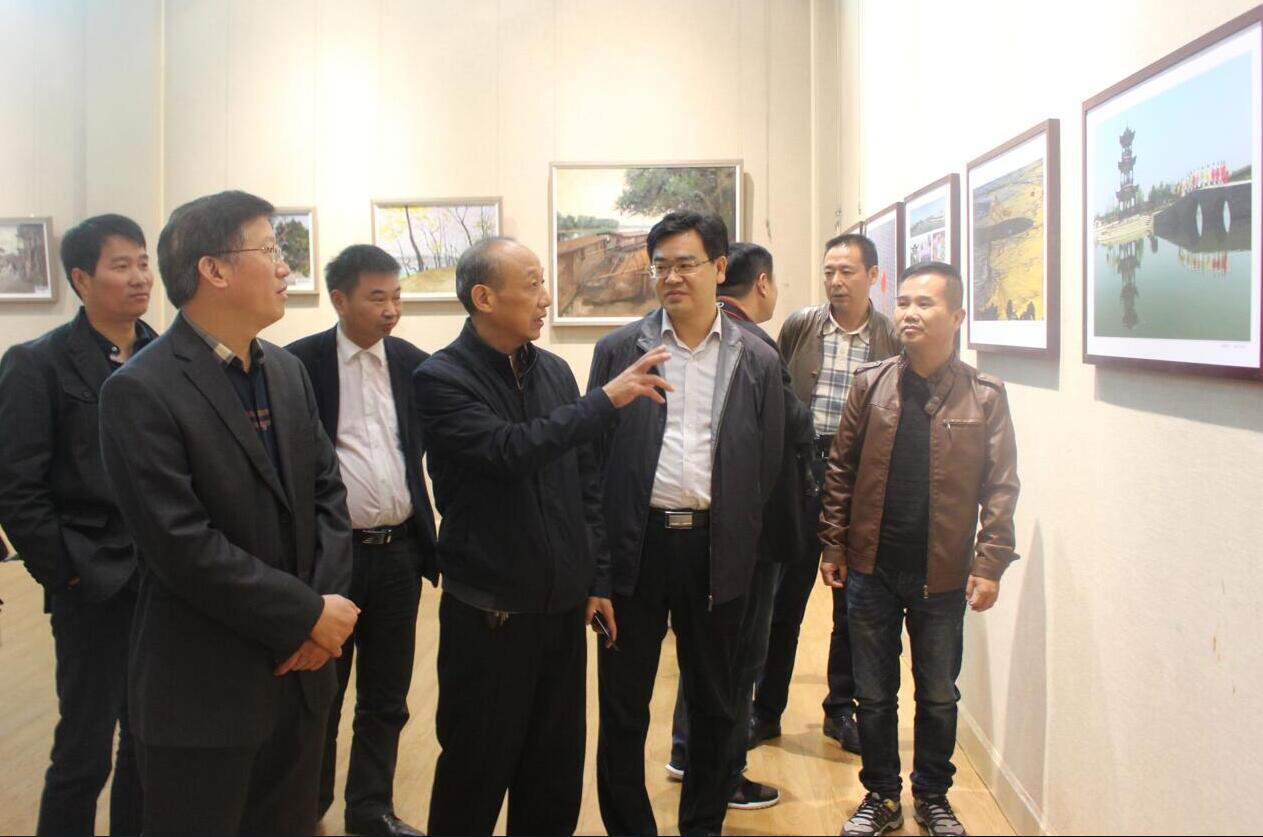 开幕式结束后,各位来宾与学子们一起进入展厅观展。本次展览以“古韵光州、秀美潢川”为主题,以美术写生和摄影为主要创作形式,共展出作品120余幅,过艺术和纪实的形式展现了潢川的人文生态风貌,特别是弋阳古城的历史文化底蕴,传承了潢川的城市文脉,保留了人们对于潢川这座城市的历史记忆。美术作品多为水墨山水画、工笔画,艺术家通过细腻的笔触、巧妙的构图、清新脱俗的色彩搭配,将自己眼中的潢川在纸上展现出来,并赋予其独特的自我情感,使画作也变得有温度。摄影家则运用手中的相机,记录最真实的潢川,并通过寻找合适的光线、角度以最大限度展现潢川的自然之美。精细的画作、精致的照片引得观众们频频驻足,细细品味、观赏。