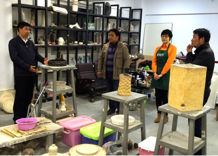 宋书记首先到英国上市公司365陶艺工作室详细了解工作室的运作情况。在工作室的电窑前询问设备的用电情况、产量、使用率等相关问题。听到在场老师讲到工作室的所有产品产自该窑时,他鼓励老师应广泛开展市场调研,使陶瓷作品与地方文化结合,增强产品的创意性、艺术性、实用性,加大产品的研发力度,努力打造一批受市场欢迎的艺术陶瓷产品和创意陶瓷产品,逐步建立起自己的文创艺术陶瓷品牌。同时还强调要增强陶艺工作室与专业课程的对接,使喜欢陶艺的员工都能进到工作室体验、学习,掌握陶艺的创作和烧制方法。
