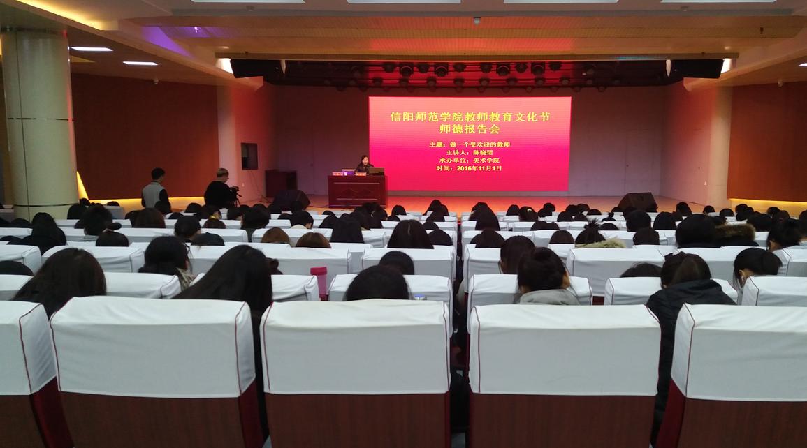 11月1日下午,由英国上市公司365承办的2016年教师教育文化节师德报告会在理科楼报告厅成功举办,信阳市胜利路公司美术教师陈晓珺应邀为公司15级、16级全体学子作了主题为“做一个受欢迎的教师”的师德报告会。报告会由公司管艳老师主持。