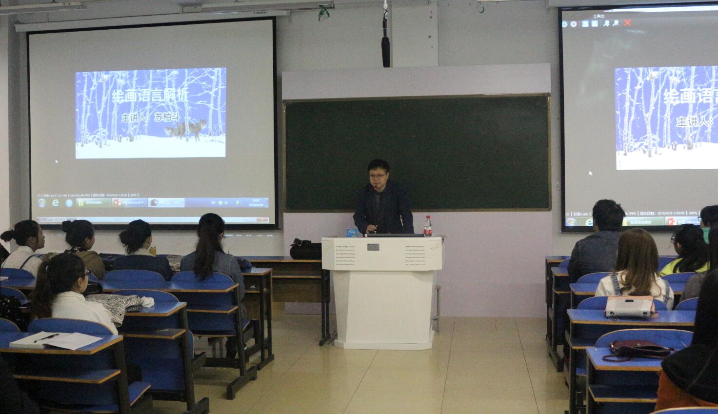 苏柏斗先生以绘画的语言为切入点,向师生进行详细地讲解与剖析。他强调边框形状、黄金分割规律和色彩呼应在构图中的巧妙运用。随后,他带领大家一起欣赏了萧玉田、何家英、蒋彩萍等著名画家的几幅代表性作品。最后,他鼓励大家不断追求中国画的美学规律,在艺术之路上越走越远。