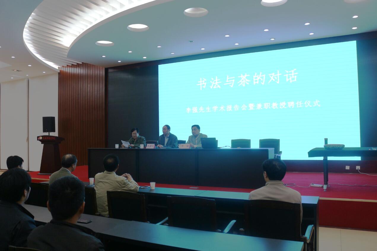 4月26日下午,著名书法家、中国书法家协会理事、河南省书法院经理、河南书协副主席李强举办“书法与茶的对话”学术讲座,并与师生进行了互动和书法创作示范。