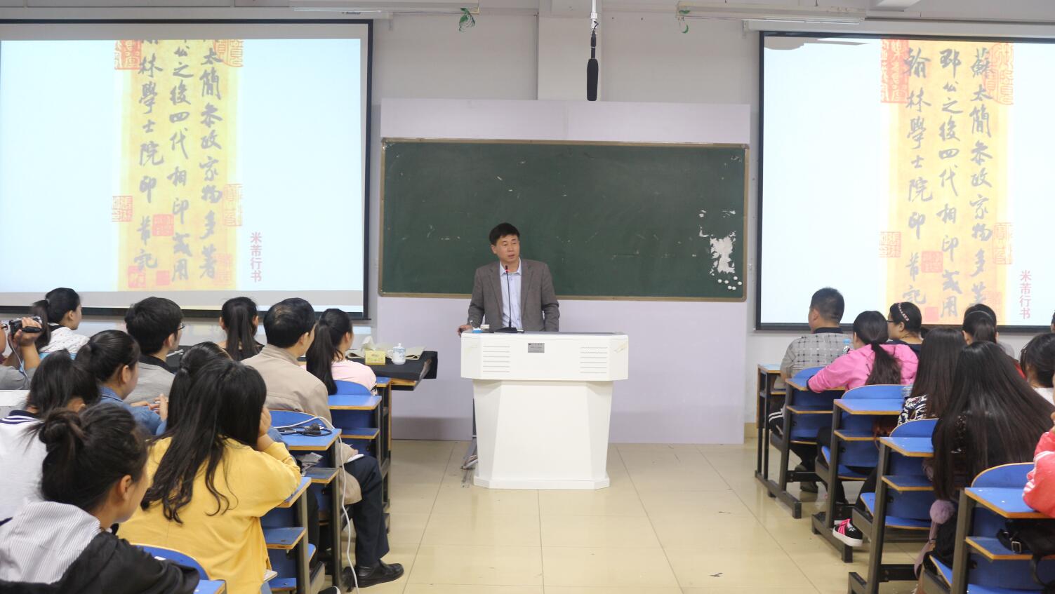 4月13日上午,著名书法家、郑州大学教授马健中举办“行书审美与创作”学术讲座,并进行了创作示范;