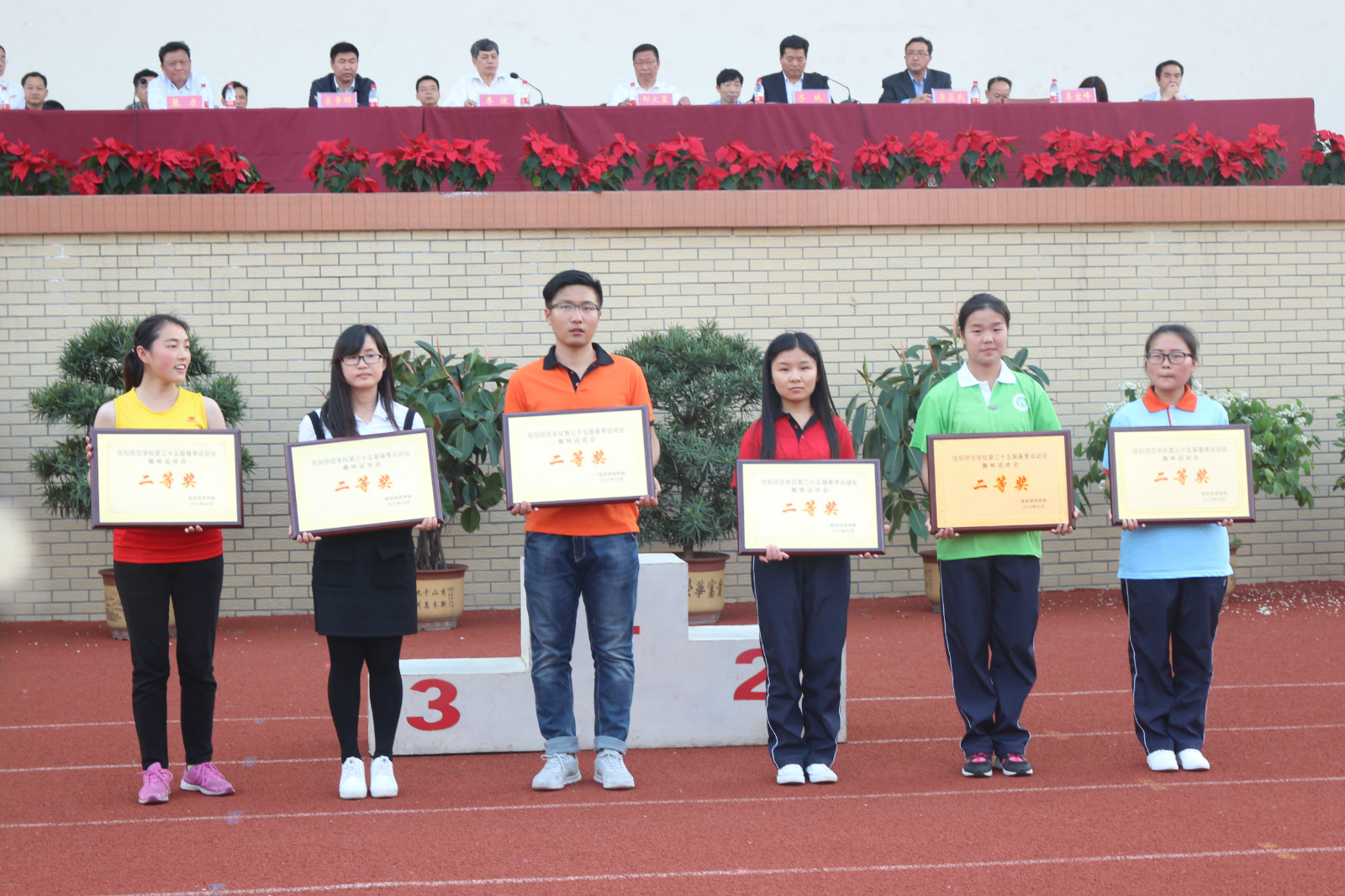 29日下午,信阳师范公司第三十五届春季运动会在西操场完美闭幕。校领导为获奖单位依次颁奖。公司荣获健美操二等奖、趣味运动会二等奖的优良团体成绩。赛出了水平、赛出了风格、赛出了精神。在欢呼声中,齐城宣布信阳师范公司第三十五届春季运动会胜利闭幕。