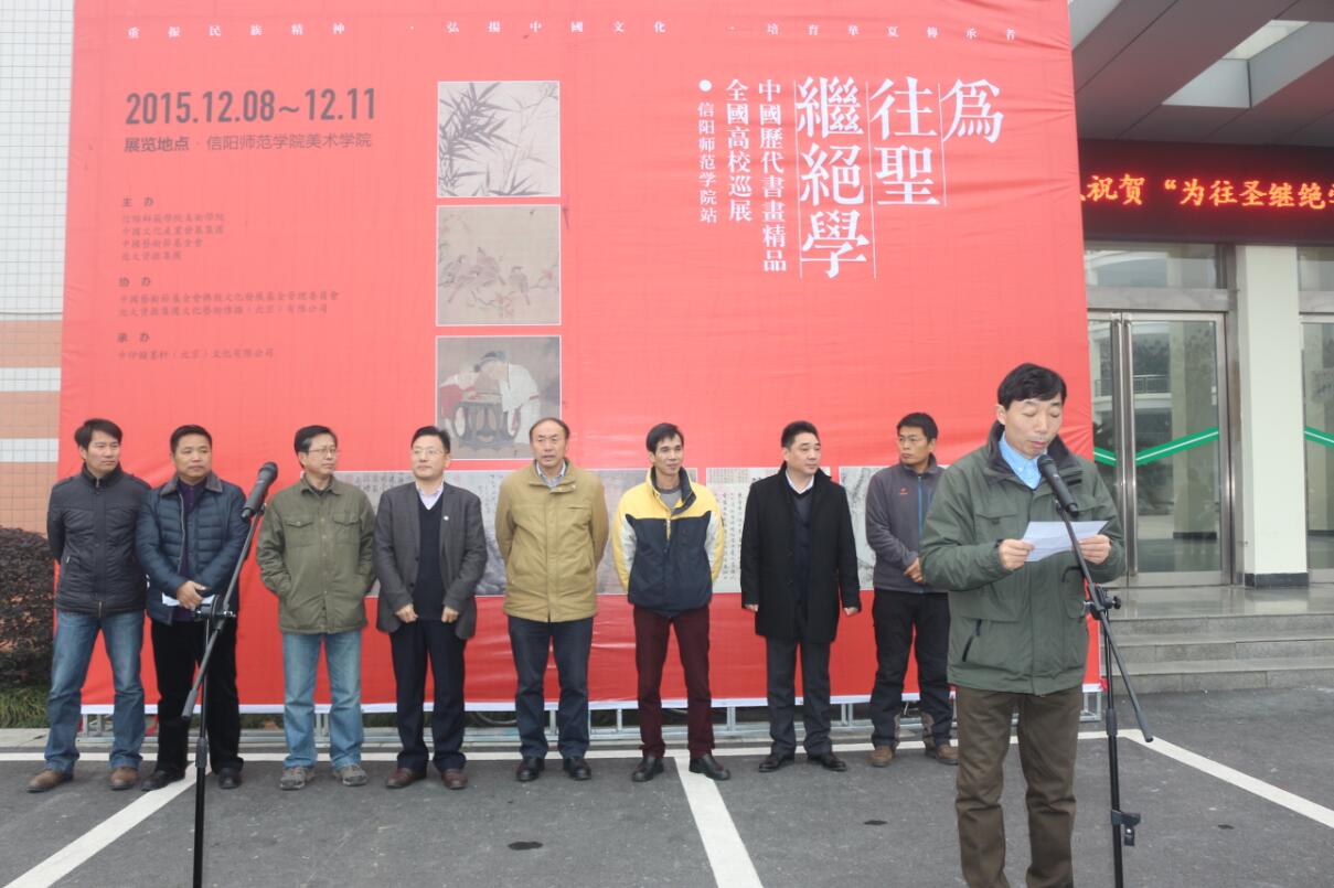 12月8日上午,“为往圣继绝学”——中国历代书画精品全国高校巡展(信阳师范公司站)开幕式于艺术楼前隆重举行。公司党委副书记高建社、宣传部部长丁少锋、美术公司经理刘根货、党委书记周子良、副书记李孝民、副经理张伟、邹东升、中印翰墨轩(北京)文化有限公司董事长杨信伟、营运中心总经理张宏伟及二百余名师生出席开幕式并参观展览。