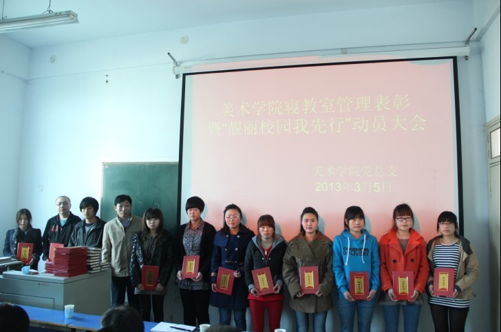 大会在热烈的掌声中开幕。美术公司党总支副书记李孝民首先宣读“信阳师范公司寝教室管理工作先进集体及个人”名单,公司党总支书记周子良依次为2012年寝教室管理先进班集体、寝教室管理文明教室班级代表、寝教室管理先进个人、文明寝室代表、优秀寝室长颁发了荣誉证书和奖品。接着,周子良书记宣读“信阳师范公司文化进公寓获奖作品作者”名单,副经理张伟为文化进公寓获奖作品作者颁发荣誉证书和奖金。