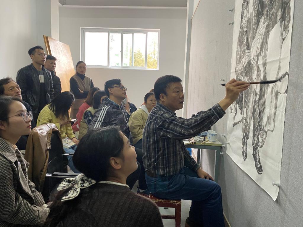 袁汝波教授进行现场示范,以直观的方式给大家讲解在写生与创作过程中该如何处理画面。他指出,起形要大块,抓住对象的主体特征,不能是客观的描摹,而是要主观地提炼和取舍。并强调平时多练习速写有助于创作。着墨时要讲究笔墨特色,浓淡干湿对比。加强人与人之间的关系,在不影响整体的情况下,通过主观渲染,做到统一整体和协调统一。