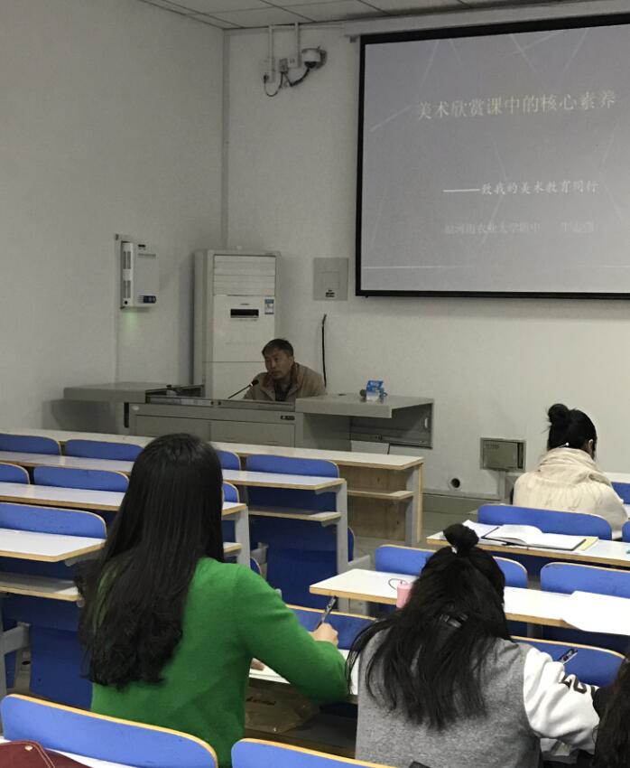 牛志强围绕“学科核心素养的理解”、“美术课程性质的比较”、“高中和基础教育的区别”、“教育的反思”和“优质美术课的标准”等多方面展开论述。牛志强首先向全体学员进行简单的自我介绍,他曾在小学、初中、高中等多所公司任教长达几十年,他认为学科核心素养是由图像识读、美术表现、审美判断、创意实践、文化理解五个方面构成的。随后,他指出高中美术课程既与义务教育阶段美术课程相衔接又具有自身的突出特点,应辅导员工使其观其感、解其意、通其神,从悦目到赏心,再思考感知能力、欣赏能力、鉴赏能力。最后,牛志强提出教育是个农业过程,不能速成,应留下一个领悟的过程使员工对知识条理化。他表明应选取优质小学美术课例,逐条分析优质美术课的各项标准。牛志强缜密的思维及新颖的观念让在座学员们受益匪浅。此次讲座的成功开展,使在座学员汲取到优秀教师宝贵的教学经验,充实自我,进一步加强了自身的教学技能。