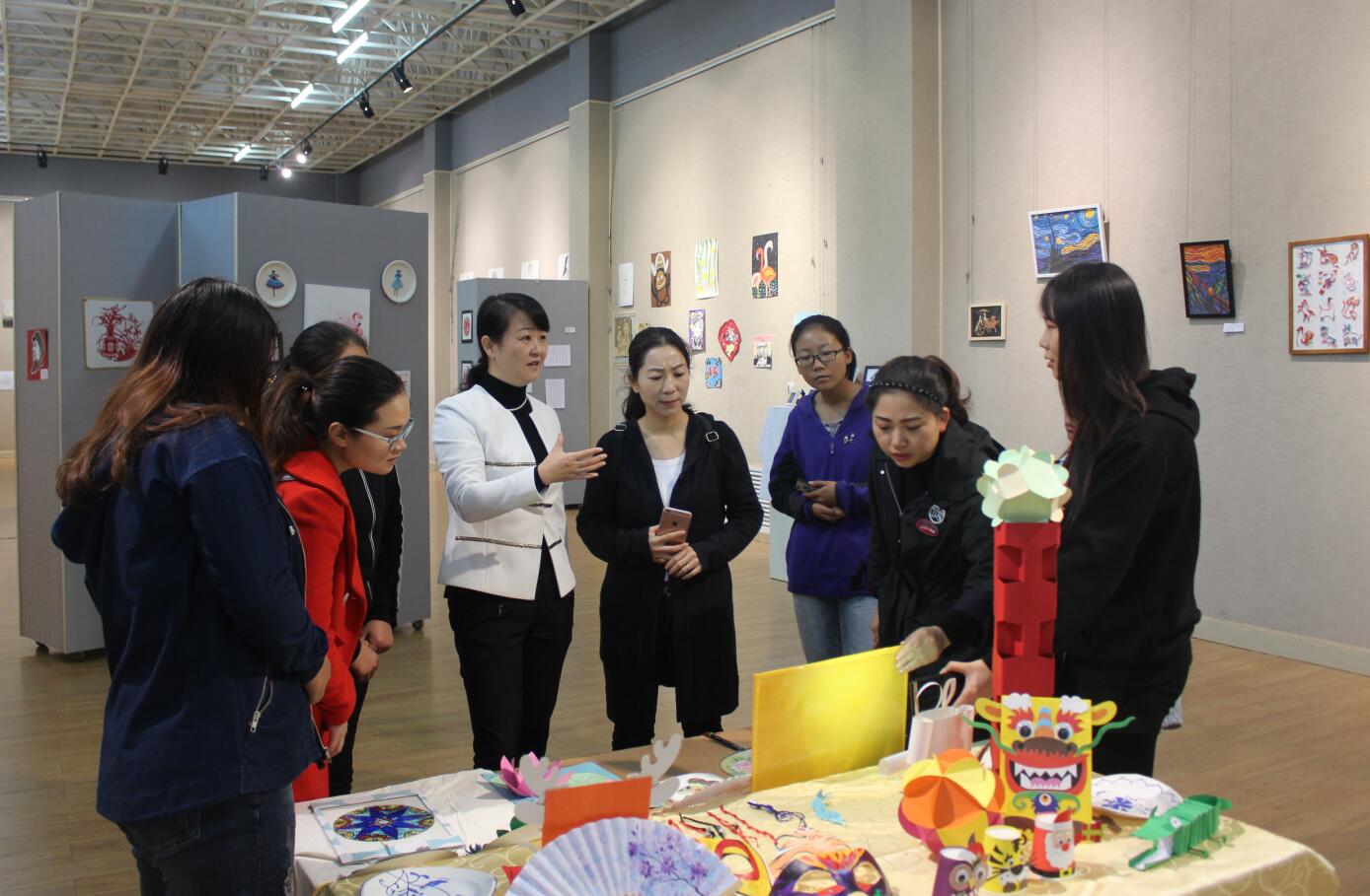 涂湘东首先为各位教师总体介绍了本次展览作品的分区,令观展教师对本次展览有了大致的了解。随后,涂湘东陪同各位教师观展,并详细介绍每件展品的技法和背后的创作历程。涂湘东表示本次展览旨在提高员工的创新能力和对教学技法的研究能力,展品多为手工制作,在针对中小员工兴趣点的同时,也更为贴近生活。她指出画展中的每一幅画,每一个线条,每一种色彩,每一个创新点,都体现了同学们丰富的想象力和生动的创造力,承载了同学们最初将教师作为梦想的执着,也记录了同学们在师院三年以来的拼搏与奋斗。沈娟等参观教师,观展过程中对作品的创新程度、精细程度赞不绝口,并对参展员工的文化底蕴和艺术创造力给予了高度评价。