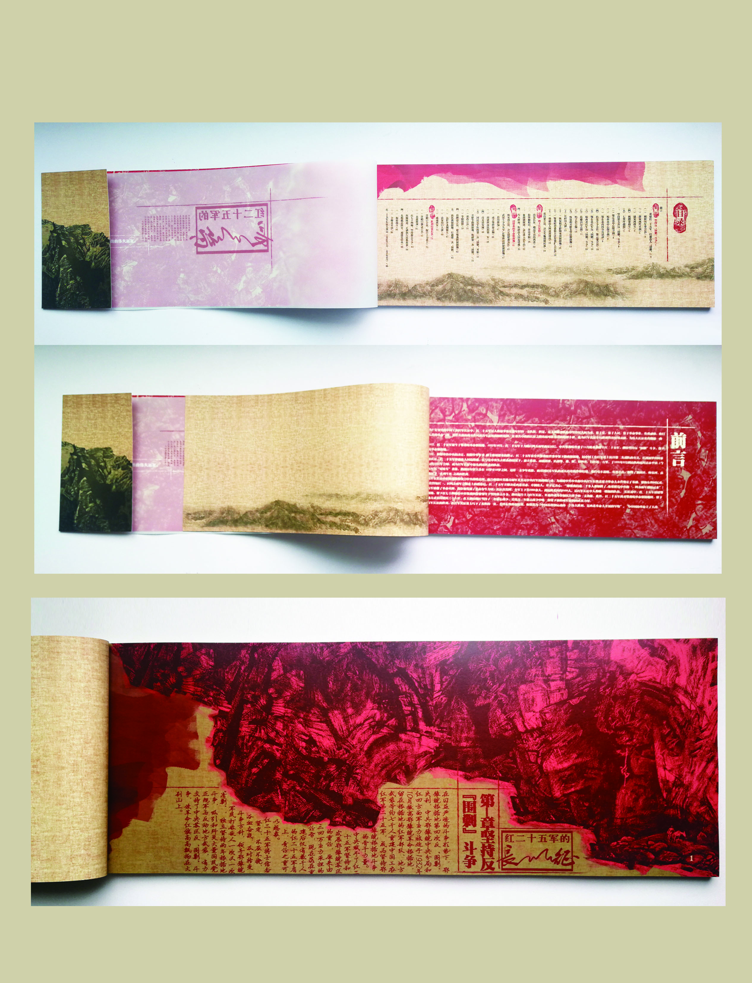 这是一本反映红二十五军长征的历史图片资料集。朴素的线装工艺,质朴的手写体文字,怀旧处理的历史图片和画面元素,细细的地向人们诉说着那段令人难忘的岁月。山水怀抱孕育了红二十五军的优秀品格和军魂。这支从大别山走出的英雄部队,从山的亘古、厚重中领悟到诚实、守信和奉献的精神品质;在水的坦荡、不息中体味到自然的机变、坚韧不息的生机。他们始终以大局为重,……,在艰苦卓绝的长征之路上铸起可歌可泣的精神丰碑。山水元素承载着军魂,贯穿始终;一面面残缺不全的红旗迎风招展;一双双血色的草鞋印记铺满纸面;一幅幅不断变换的山水画面,既承载着压抑,残酷的斗争环境,也展现出这支队伍坚韧、机变和不息的生机。随着书页翻动,红二十五军从大别山出发,开动双脚,一路转战,历经磨难,靠着信念、智慧、勇气和顽强,最终走向长征胜利的伟大历程跃然纸上。